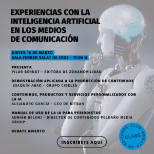 CLABE ha organizado una jornada bajo el lema ‘Experiencias con la Inteligencia Artificial en los medios de comunicación’ para el próximo jueves día 16 de marzo en la sede de CEOE a las 17.00 horas. Estará presentado por Pilar Bernat, editora de Zona Movilidad, y contará con Joaquín Abad, del Grupo Cibeles, quién hará una … Leer más